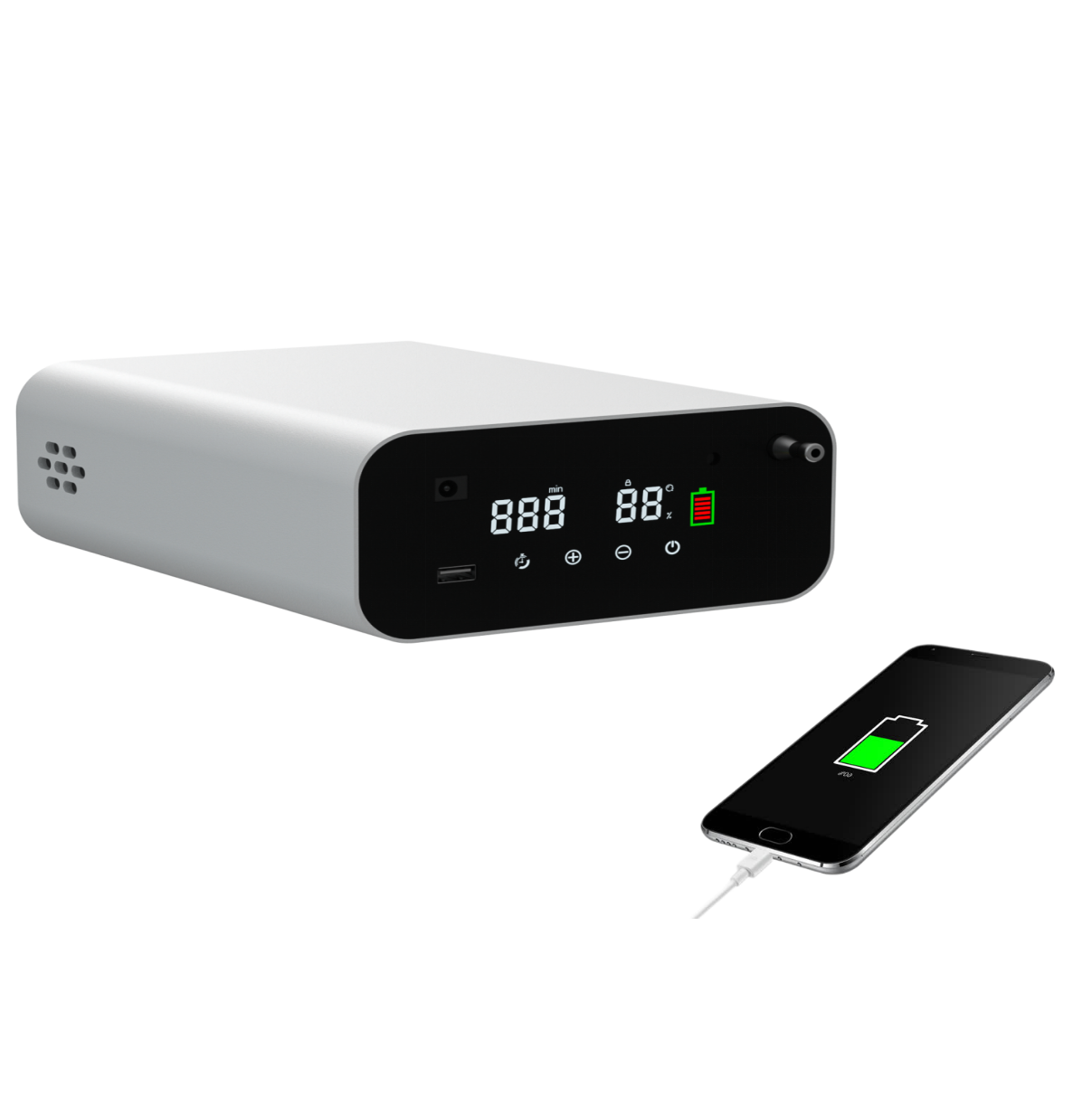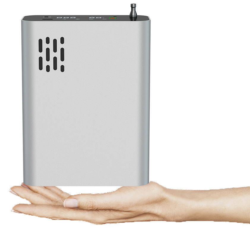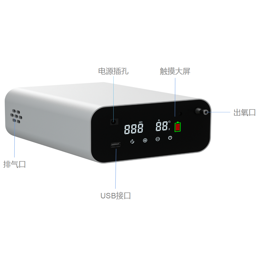 制氧机外观简洁大方,采用高强度铝合金型材。设置不锈钢出氧口,保证出氧洁净卫生;增加防震脚垫应对各种环境;配置USB输出接口;采用长寿命、大容量电芯储能;配合智能化管理系统,人机交互容易,使用操作简单。